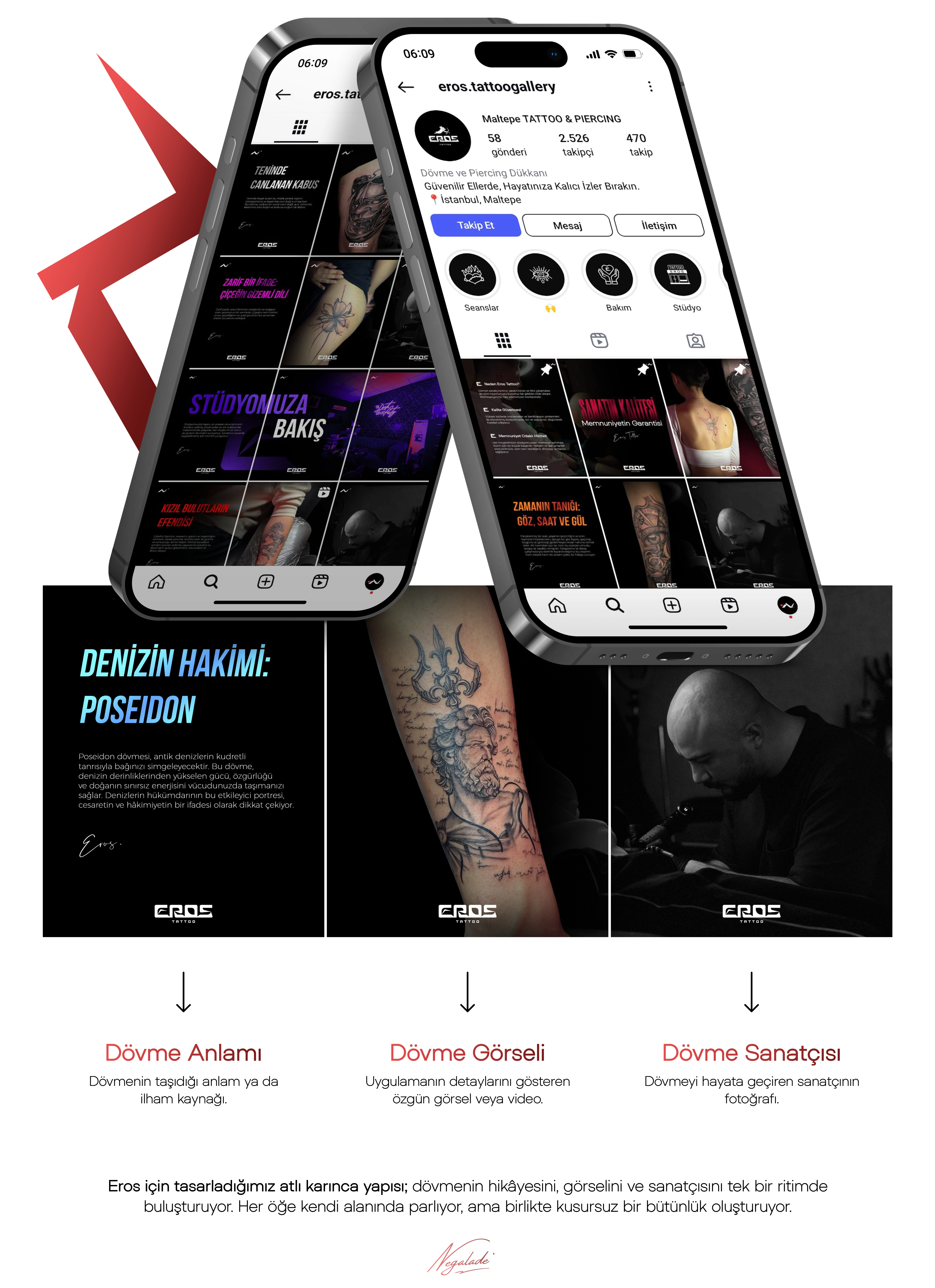 Eros Tattoo için yürüttüğümüz sosyal medya yönetimi sürecinde, markanın sanatsal gücünü ve özgün tarzını dijital dünyada görünür ve etkileyici kılmayı hedefledik. Sosyal medya, sadece bir paylaşım alanı değil; Eros Tattoo’nun tarzını, vizyonunu ve işçiliğini yansıtan güçlü bir sahneye dönüştü.